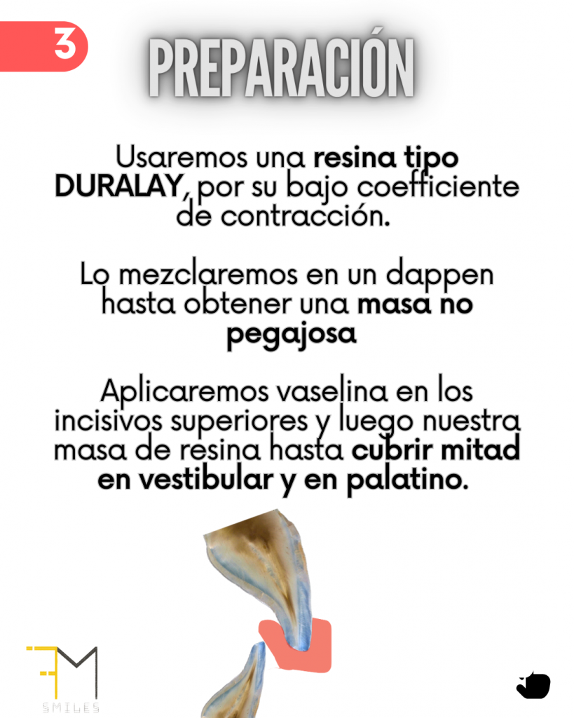 Una vez que los dientes superiores están preparados, aplicaremos la masa de resina en el Jig de Lucia. Cubriremos aproximadamente la mitad de la resina en la superficie vestibular de los incisivos superiores y la otra mitad en la superficie palatina. Es importante distribuir uniformemente la resina para asegurar una cobertura adecuada en todas las áreas del Jig.