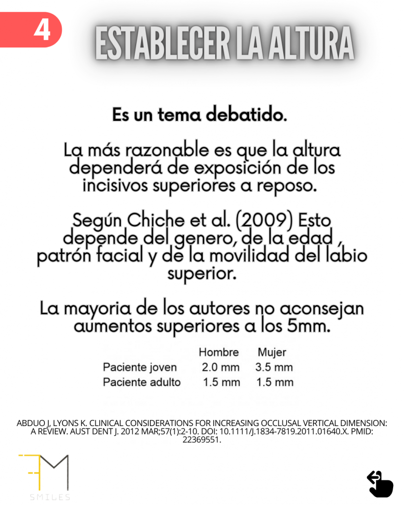 El establecimiento de la altura correcta en aumentos de dimensión vertical es un tema debatido en la odontología restaurativa, ya que puede variar según diferentes factores. La perspectiva más razonable sugiere que la altura adecuada dependerá de la exposición de los incisivos superiores en reposo. Este enfoque considera que la dimensión vertical influirá en la estética, la funcionalidad y la armonía facial del paciente.