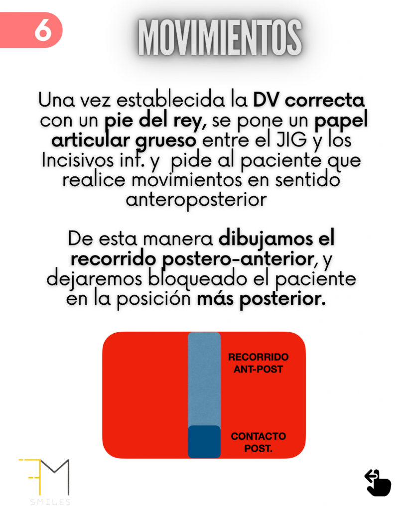 A medida que el paciente realiza los movimientos anteroposteriores, el papel articular grueso registrará el recorrido posteroanterior de la mandíbula. Esto nos permite visualizar y comprender mejor cómo se mueve la mandíbula en relación con el Jig de Lucia y los incisivos superiores e inferiores. Observa cualquier punto de contacto prematuro o interferencia oclusal que pueda surgir durante estos movimientos.