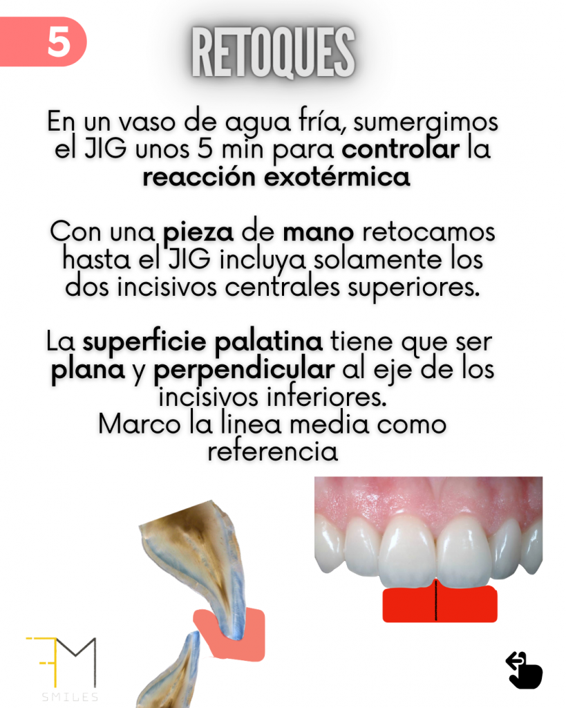 Después de retirar el Jig del agua fría, utilizamos una pieza de mano con una fresa adecuada para retocar el Jig. El objetivo es ajustar el Jig para que incluya solamente los dos incisivos centrales superiores del paciente. Esto se hace para limitar el contacto del Jig con los dientes y garantizar una colocación precisa y cómoda en la boca del paciente.