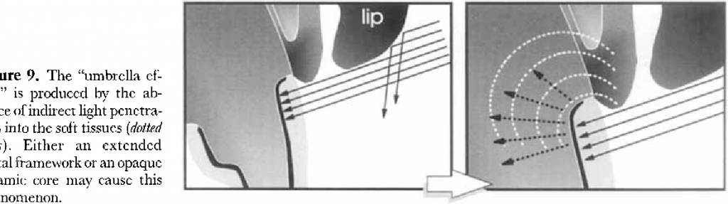 Referencias: Magne P. (2006). “Optical integration of dental ceramics and tooth structure: understanding the umbrella effect”. https://www.sciencedirect.com/science/article/pii/S0109564106000351