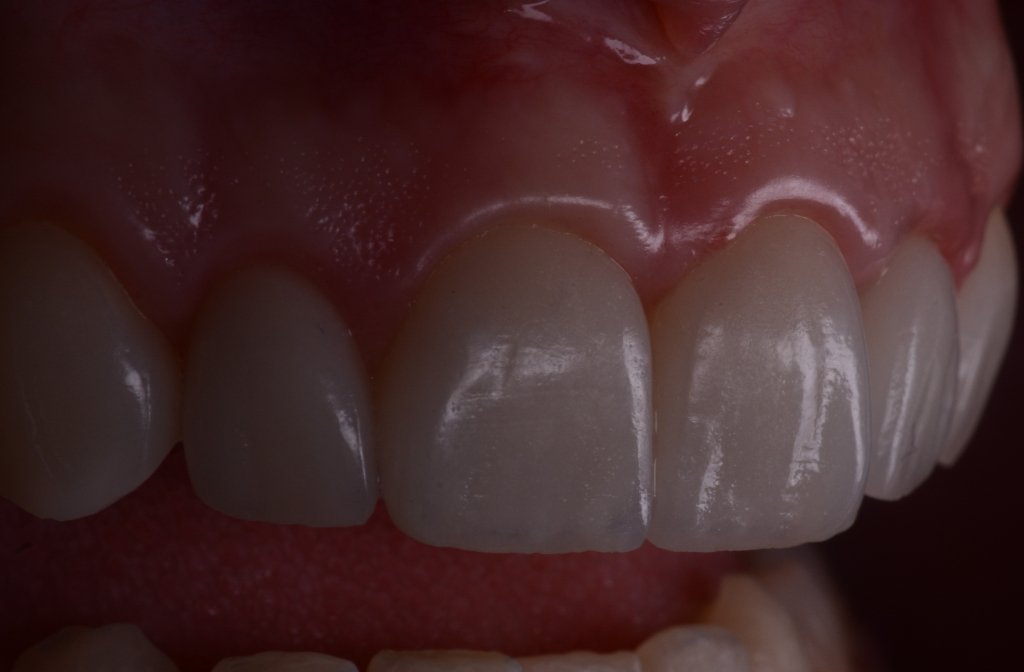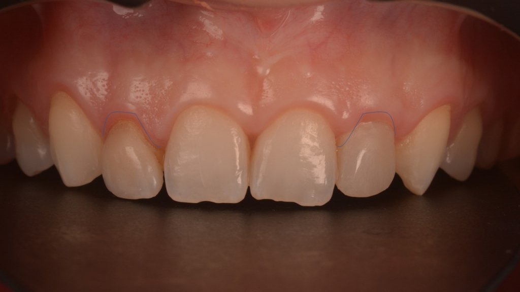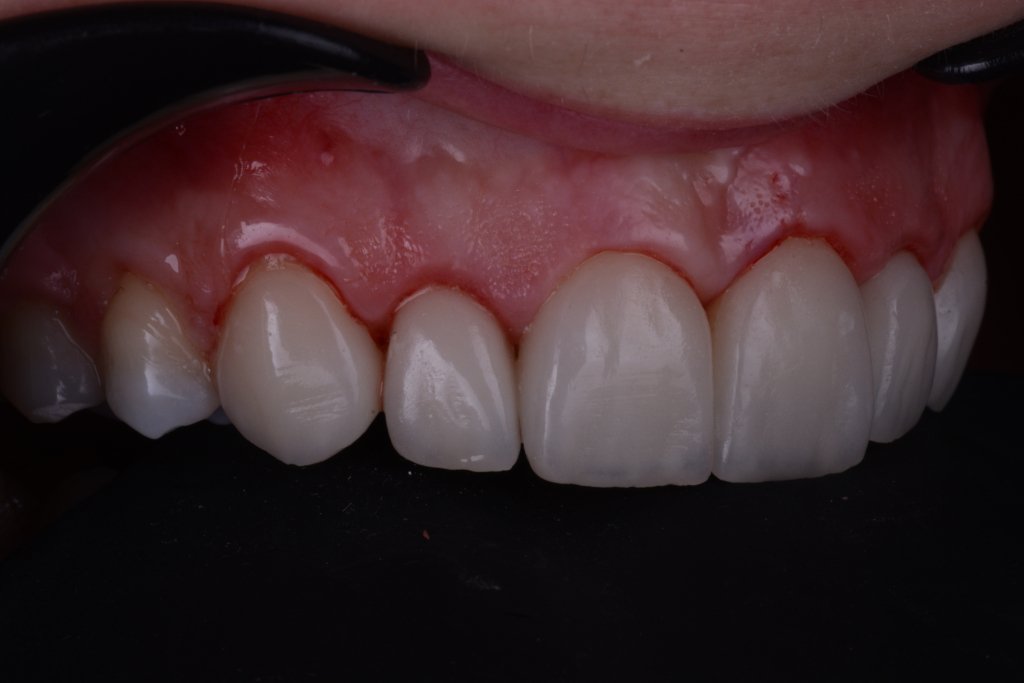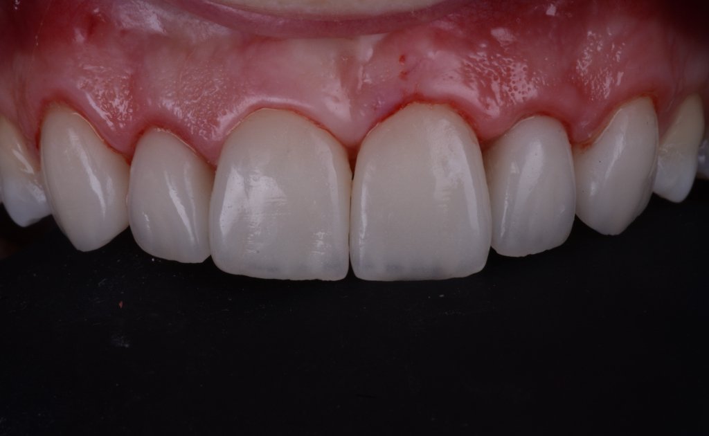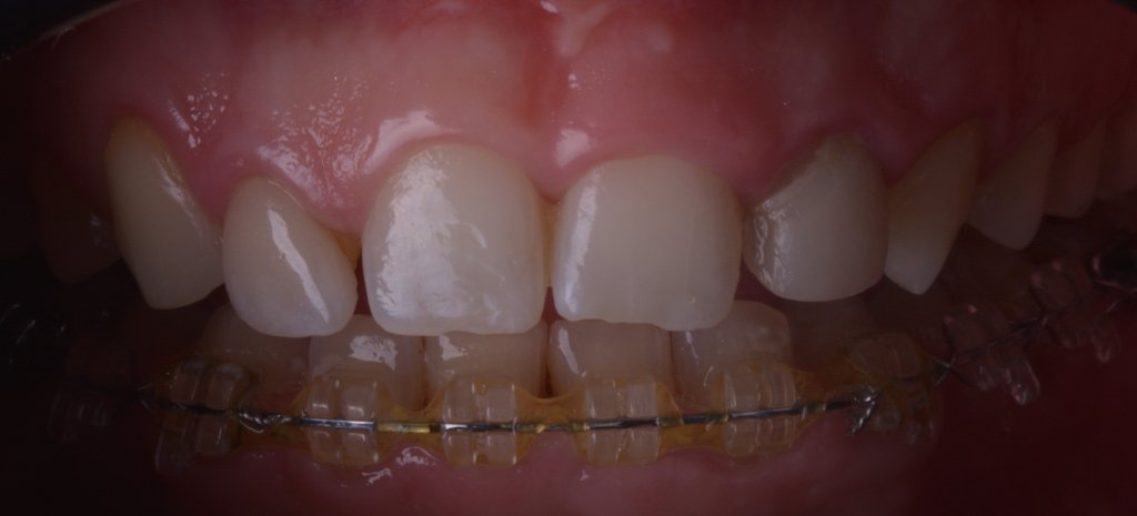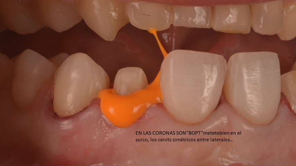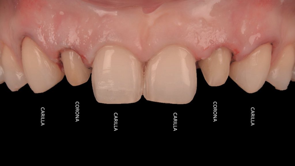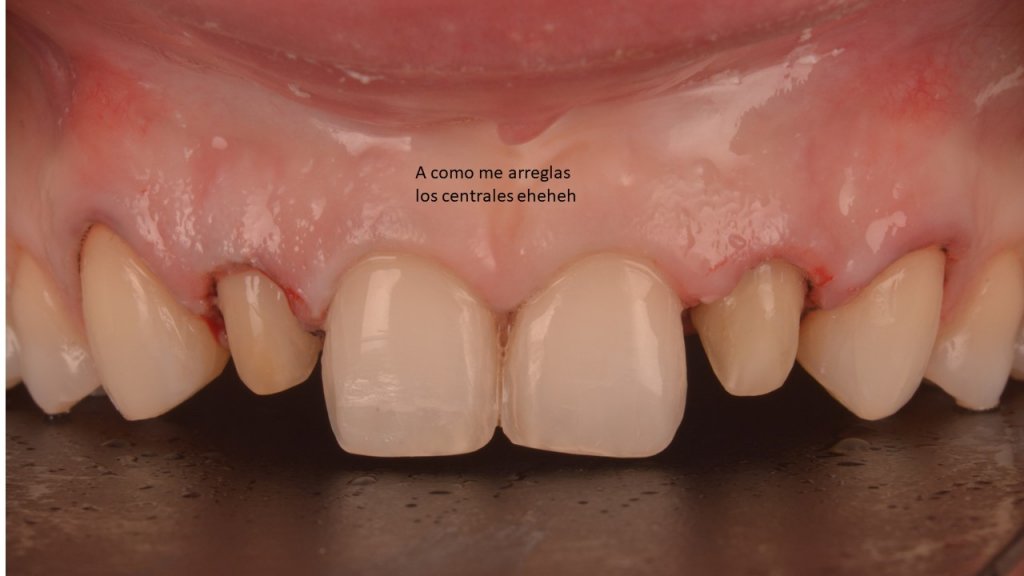 El inconveniente es que la encía, con un torque ridículo lingual de la raíz y la carilla desadaptada, volvía continuamente a bajar al no tener soporte.