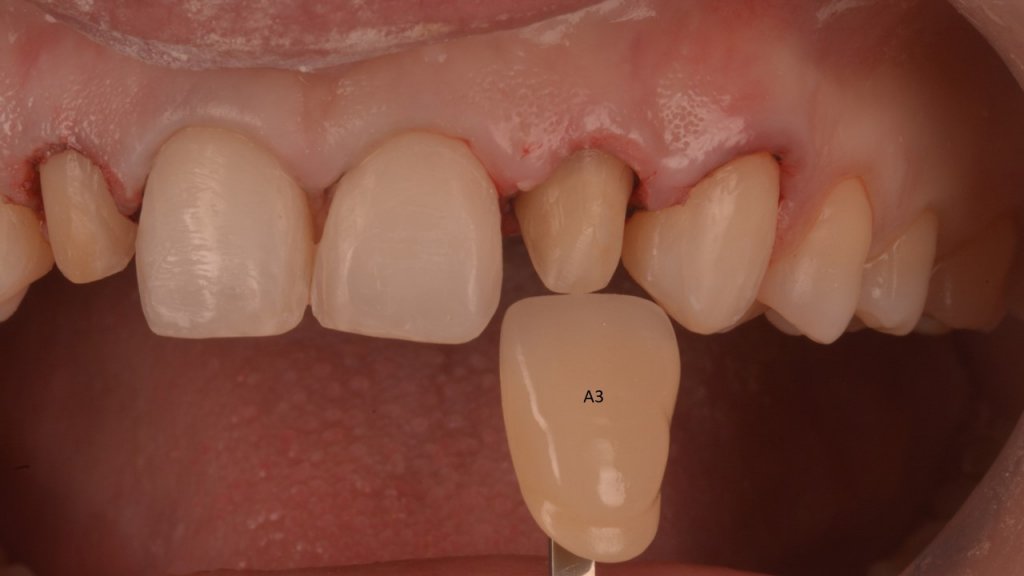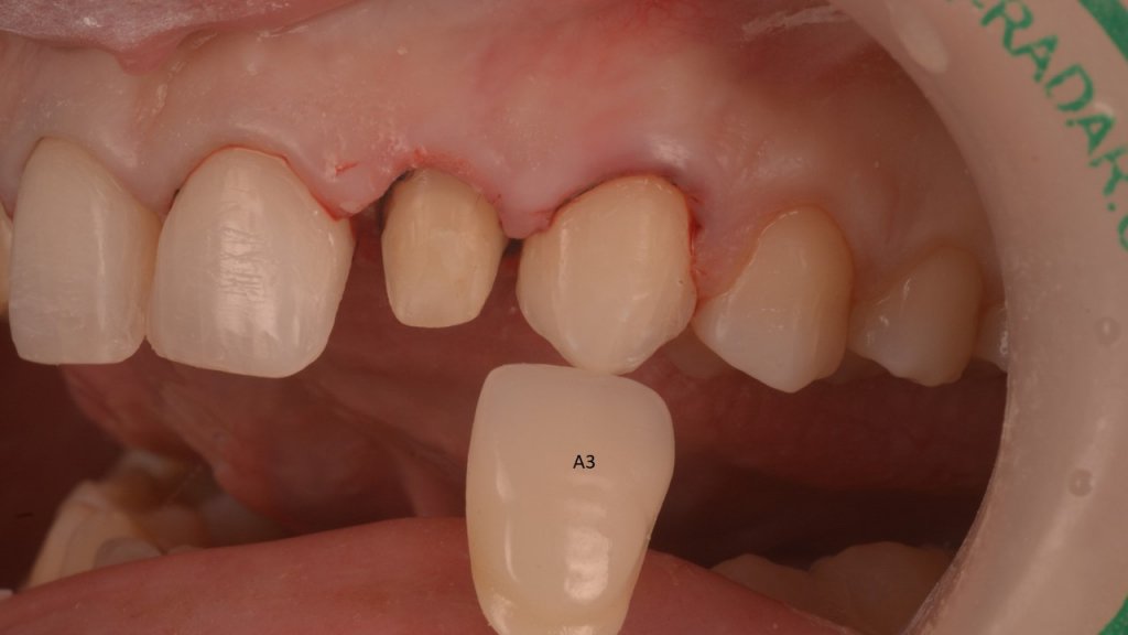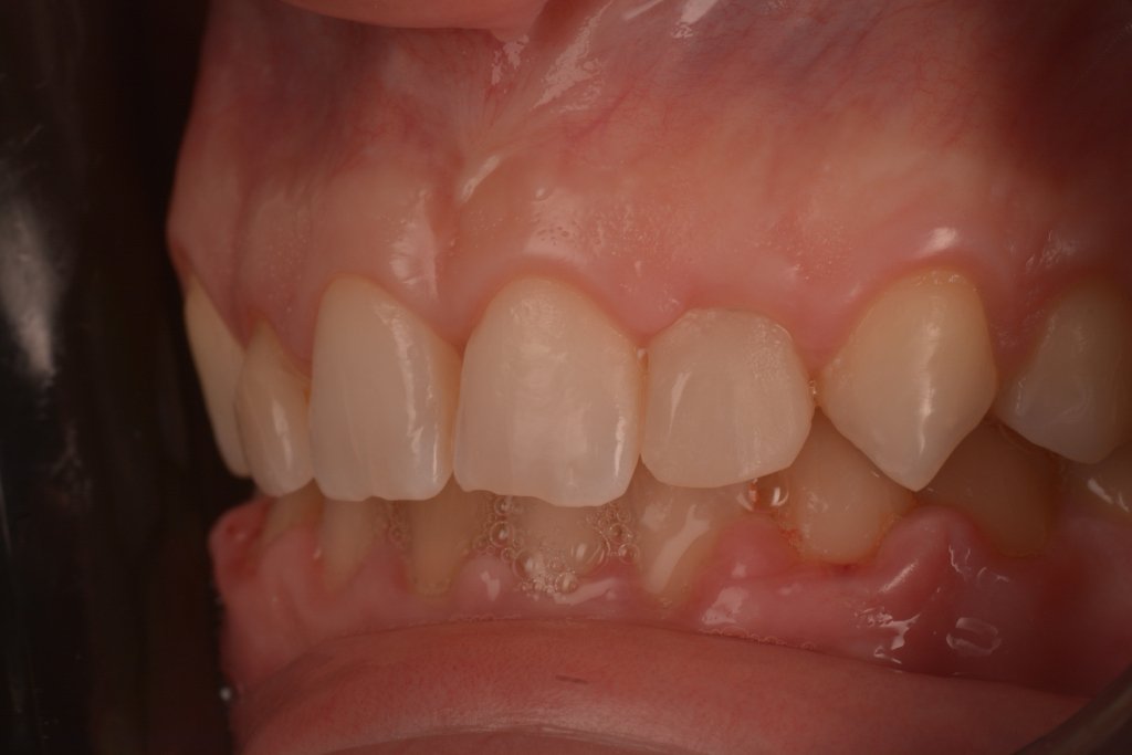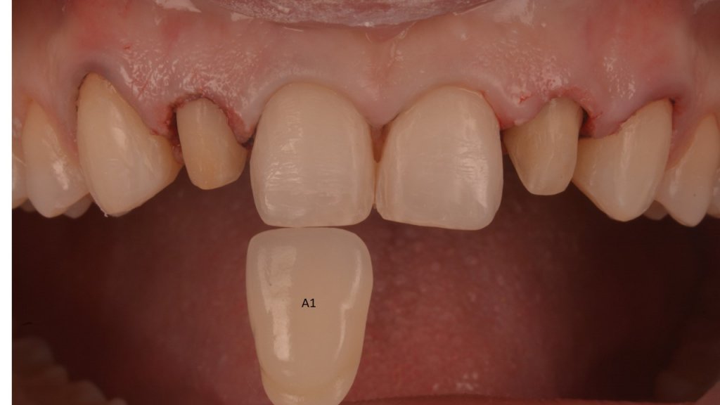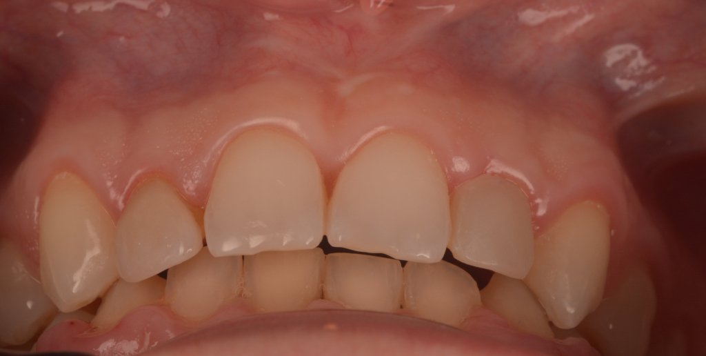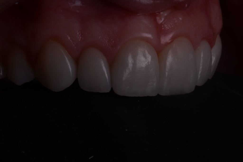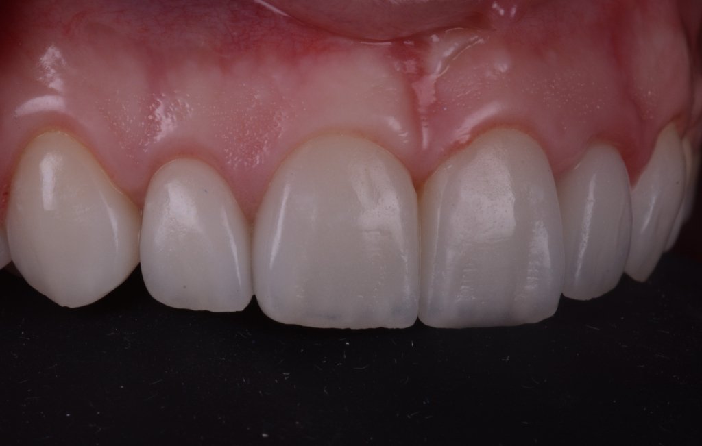 El inconveniente es que la encía, con un torque ridículo lingual de la raíz y la carilla desadaptada, volvía continuamente a bajar al no tener soporte.