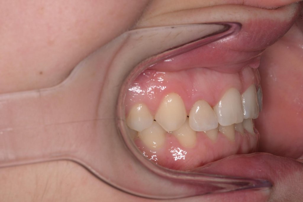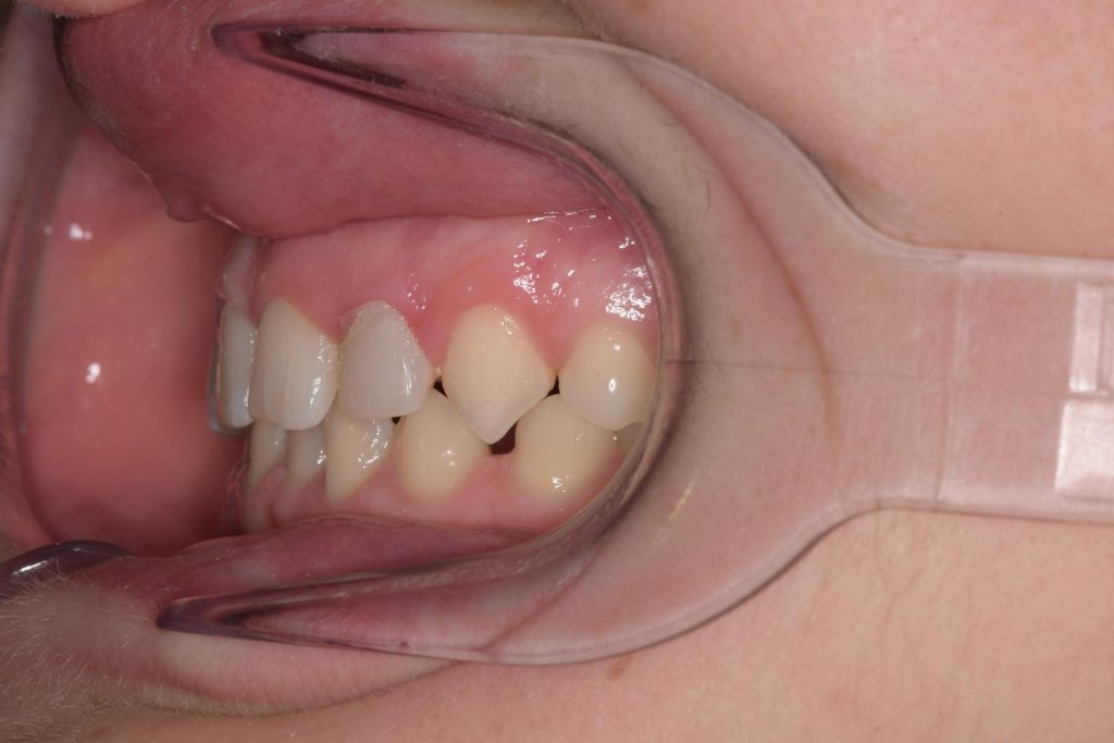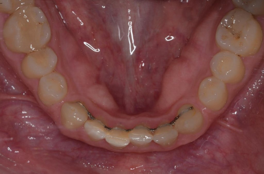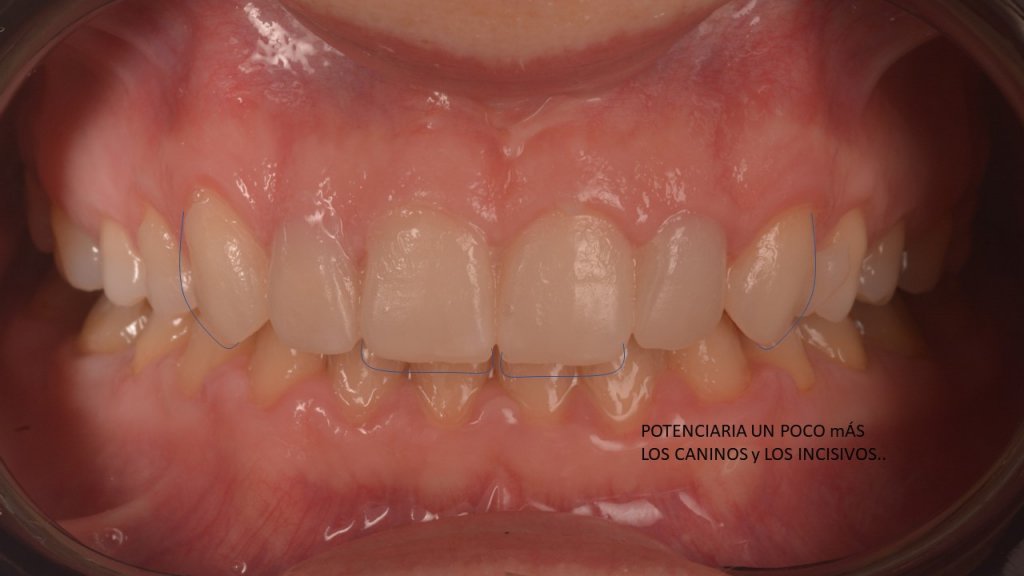 La paciente rechazaba cualquier tipo de tratamiento ortodontico (por cansancio y porque trabaja cara al publico), tras mucho esfuerzo consigo convencerla a ponerse ortodoncia al menos en la arcada inferior para aprovechar de estos espacios para ganar resalte y corregir la sobre mordida y sobre todo poder generar una guía canina una vez completado el tratamiento restaurador.
